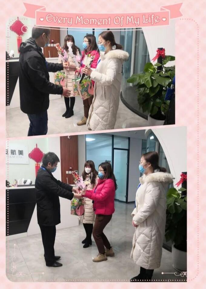 節(jié)日當(dāng)天下午,楊總攜公司領(lǐng)導(dǎo)為上班的女同事們送上溫馨的祝福和禮物。